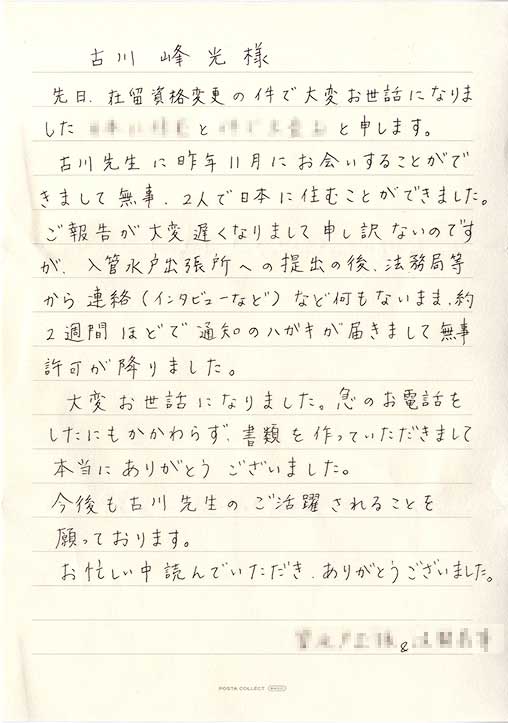先生の迅速な対応のおかげで、帰国準備期間期限内に、変更申請をすることができました。そして、なにより、配偶者ビザも実質15日(受け取ったのは申請から3週間程後)で無事に許可頂くことができました。