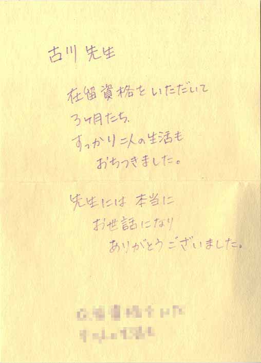 今回、絶対に失敗したくないという思いもありましたが、運良く入管業務のスペシャリストである古川先生に相談することが出来てとても良かったと思いました。本当に感謝しています。ありがとうございました。
